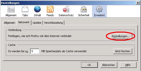 Die Schüler starten Mozilla Firefox. Im Menü Extras -> Einstellungen wählen sie in der Registerkarte Netzwerk den Button für die Verbindungseinstellungen.