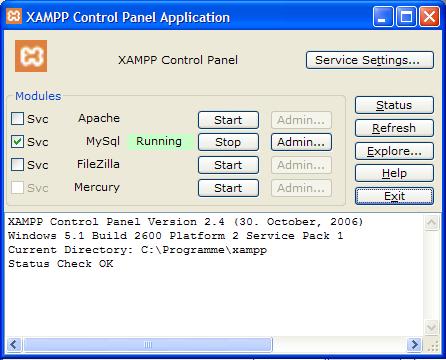 So sieht das XAMPP Control Panel aus. Apache Webserver und MySQL müssen beide gestartet sein für den Betrieb. Unter Service Settings kann man dies als Standardeinstellung festlegen.
