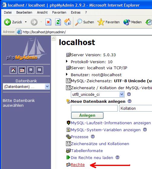 Die Oberfläche von PhpMyAdmin. Links kann man bestehende Datenbanken auswählen und öffnen. Rechts lassen sich neue Datenbanken erstellen. Unter "Rechte" lassen sich die Berechtigungen und Passwörter der Benutzer setzen. Am Anfang sollte hier das Passwort des root-Benutzers verändert werden.