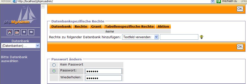 Auf der Begleit-CD zur Handreichung des ISB, die auch unter http://www.isb.bayern.de/isb/index.asp?MNav=6&QNav=12&TNav=1&INav=0&Pub=957 heruntergeladen werden kann, finden Sie im Verzeichnis Material/Datenmodellierung und Datenbanksysteme/XAMPP Serienbriefe zum Einrichten von Benutzern. Diese erlauben Ihnen das Einrichten von Accounts, die je nach Bedarf Lese- und Schreibrechte auf bestimmten Datenbanken haben. Wenn Sie über die Begleit-CD zum Buch des Oldenbourg-Verlags verfügen, finden Sie darauf auch eine Anleitung zum Gebrauch, ist aber im Grunde selbsterklärend.