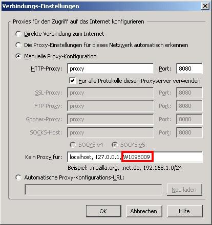 Daraufhin öffnet sich das Fenster "Verbindungseinstellungen". Bei der manuellen Proxy-Konfiguration wird unter den Ausnahmen für den Proxy die W-Nummer des Servers eingetragen (im Screenshot: W1098009). Der Zugriff auf den Server erfolgt anschließend über http://W1098009.